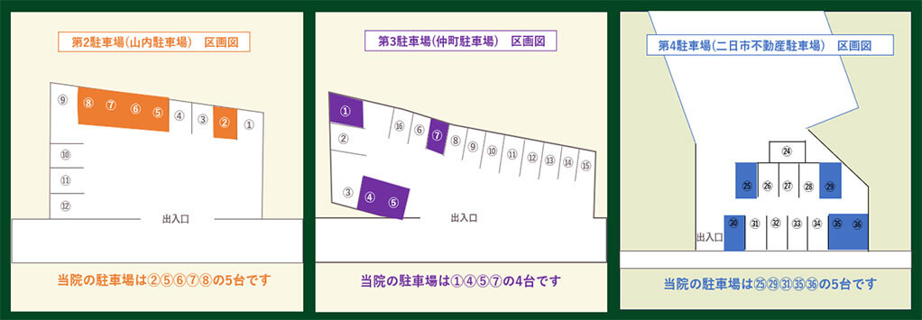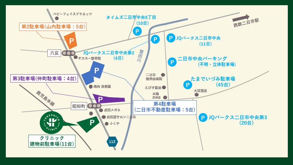 クリニック近辺に第2-4駐車場を計14台ご用意しております。駐車場の数に限りがございますので、近隣のコインパーキングや公共交通機関を併せてご利用ください。※クリックすると別ウィンドウで開きます。 ※第4駐車場に関しましては、隣地に薬局が開設されるまでの一時的な利用となります(2026年8月予定)。